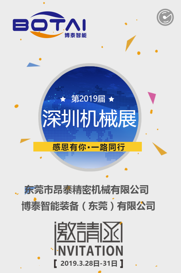 第20届深圳国际机械制造工业展览会 地址:中国.深圳会展中心 展位:8号馆 8C49 现诚邀阁下于2019年3月28日至31日莅临我司展台 参观感谢您的支持 yabo鸭脖智能装备(东莞)有限公司